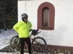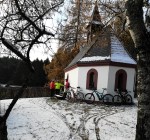 Vier mit Motor. Auf dem Peterberg hat es geschneit, fahren wir halt hin, schauen nach, ob das auch wirklich stimmt, es war nicht gelogen und kalt war`s, deshalb gab es an der Kapelle auch Fürsorglich einen Apfel/Schlehenschnaps. Hat aber nichts genutzt bei mir, ab Selbach sind die Griffel so kalt geworden, dass ich kaum noch den Lenker halten konnte, bei den Kameraden war es ähnlich und bei einem waren es die Zehen, wer wissen will, wer das war, muss beim nächstenmal einfach mitfahren.