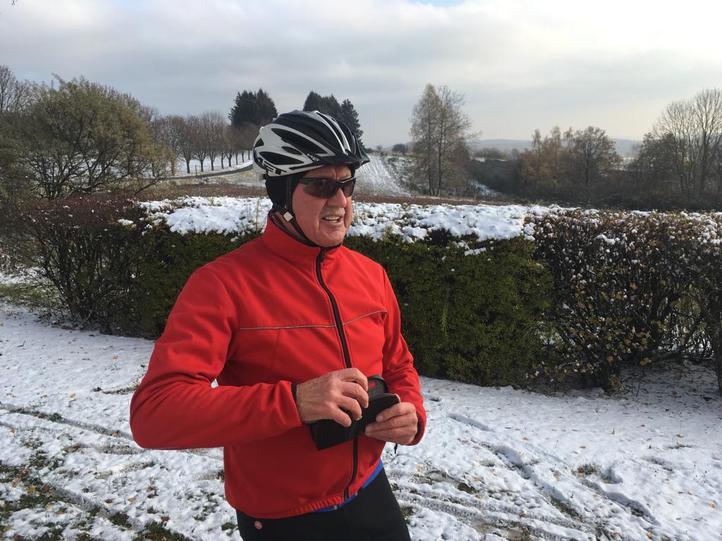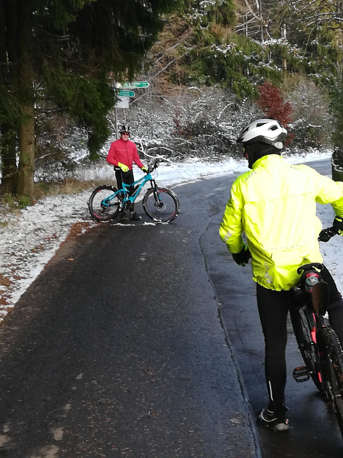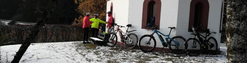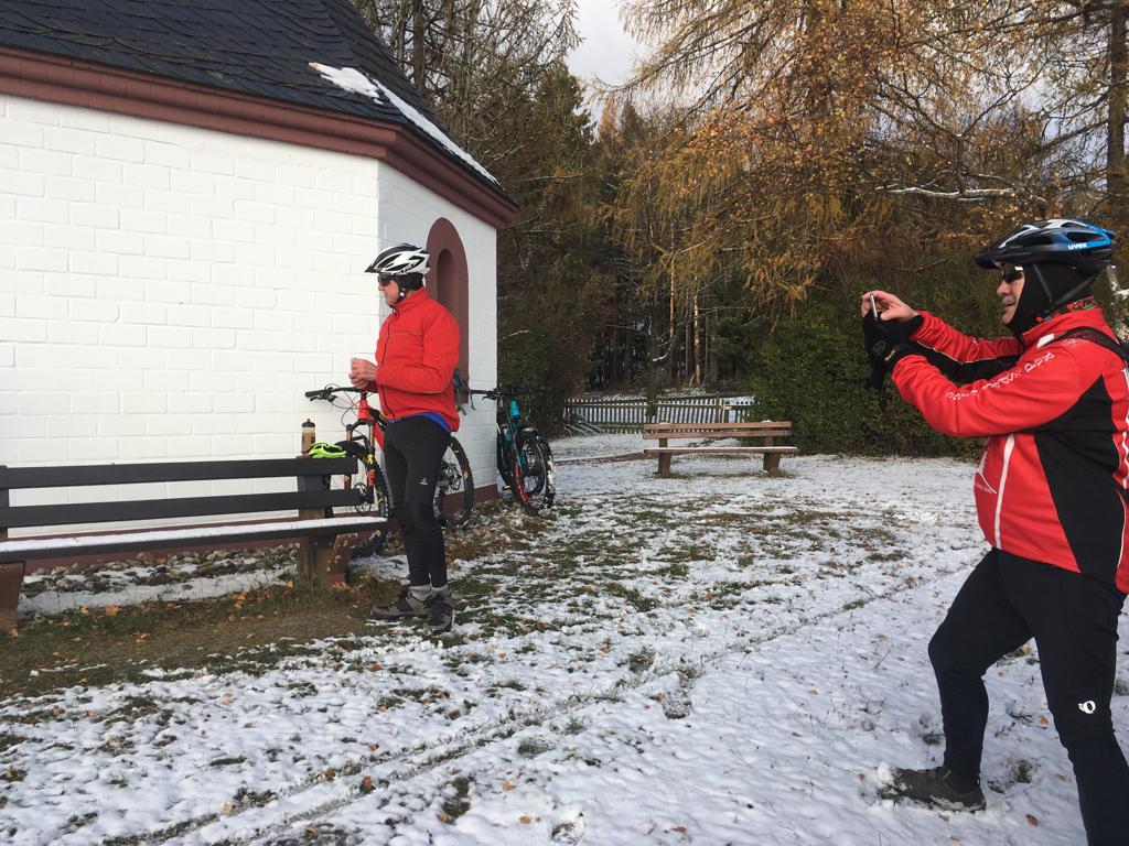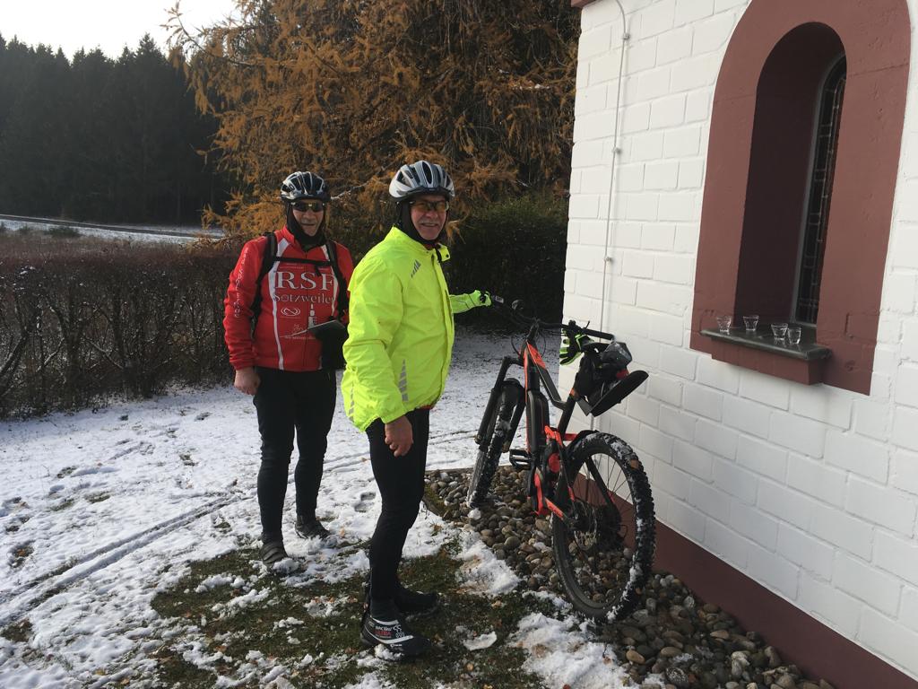Vier mit Motor. Auf dem Peterberg hat es geschneit, fahren wir halt hin, schauen nach, ob das auch wirklich stimmt, es war nicht gelogen und kalt war`s, deshalb gab es an der Kapelle auch Fürsorglich einen Apfel/Schlehenschnaps. Hat aber nichts genutzt bei mir, ab Selbach sind die Griffel so kalt geworden, dass ich kaum noch den Lenker halten konnte, bei den Kameraden war es ähnlich und bei einem waren es die Zehen, wer wissen will, wer das war, muss beim nächstenmal einfach mitfahren.