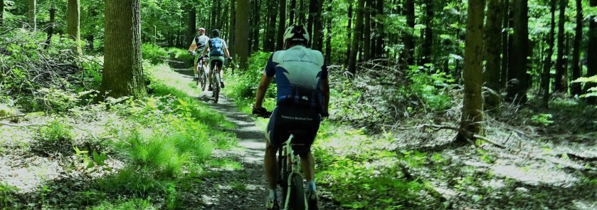 Meine Strasse in der Humes runter, (wo ich in meiner Jugend gewohnt habe) und dann den Elmersberg hoch in den Dirmingerwald, mindestens 1 Km dann auf dem klasse Trail fast bis Eppelborn (Erich`s Lieblingstrail). Durch Calmesweiler fuhren wir nach Macherbach zum Geplatzten, (zum Pflug) ein Alkohlfreies Cola Weizen, ein bis`chen Bla bla und weiter dann zur Josephskapelle. Micky und ich hinter der Kapelle den Trail hoch und der Rest der Mannschaft an den kleinen Weihern vorbei bis zur Autobahn wo wir wieder zusammen kamen. Anstatt auf der Hohen Straße, fuhren wir noch am Exweiler Weiher vorbei, wo ein Junggesellen Abschied gefeiert wurde, aber wir hatten keine Zeit um zu Gratulieren, (obwohl wir kurzfristig eingeladen wurden) die Sonne, der Kaffee und Kuchen hinterm Haus, warteten schon.