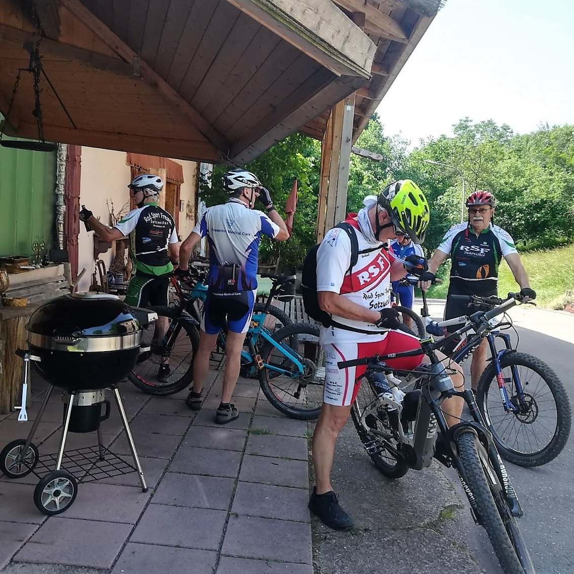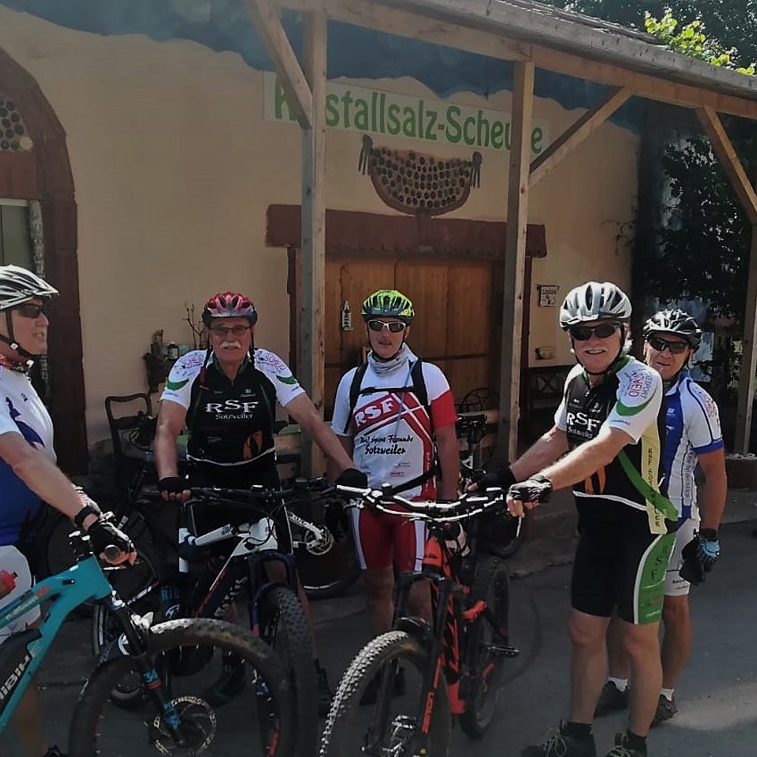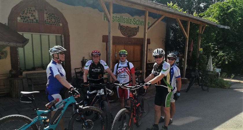 Wegen der Wetterprognose wurde wiederum der Start auf 09:00 Uhr vormittags festgelegt und das war auch gut so! An der Bregg konnten wir diesmal einen neuen, alten Bekannten begrüßen: Jörg is back und er traute sich nur mit Muskelkraft auf die oben beschriebene Strecke. Die Idee kam von Heinz, denn Auschet war bisher auf unserem Tourenkalender ein weißer Fleck! Überhaupt der Name Auschet, was er wohl übersetzt heißt? Vermutlich „oh Schitt“, oder so ähnlich. Alle Fahrer staunten an der Kristallsalzscheune, nicht nur über die orginelle Bauweise, auch das Wohnhaus ist, trotz seiner alten Bausubstanz liebevoll, mit Sinn für Details, in einem südländischen Stil gestaltet. Leider konnten wir die Spezialitäten des Hauses nicht nutzen, ua. wird dort Folgendes angeboten: Dampfkabinen mit Spezialsalzen, bengalischer Beleuchtung und Entspannungsmusik. Der Hit aber sind Biertastings. Der Wirt hält über 50 internationale Biere vor, hauptsächlich aus dem angelsächsischen Raum, darunter eine Hammersorte mit sage und schreibe 57%!!! Danach kommst du nur noch mit dem Rettungswagen nach Hause. Aber auch Wein -und Whiskyliebhaber kommen hier auf ihre Kosten! Die Pause wurde am Überlosheimer Weiher eingelegt und nach dem Erklimmen des Bitschberges -entlang der Wiesbach- wurde es höchste Zeit die nahende Heimat in den Blick zu bekommen, denn die Schwüle wurde immer unangenehmer.