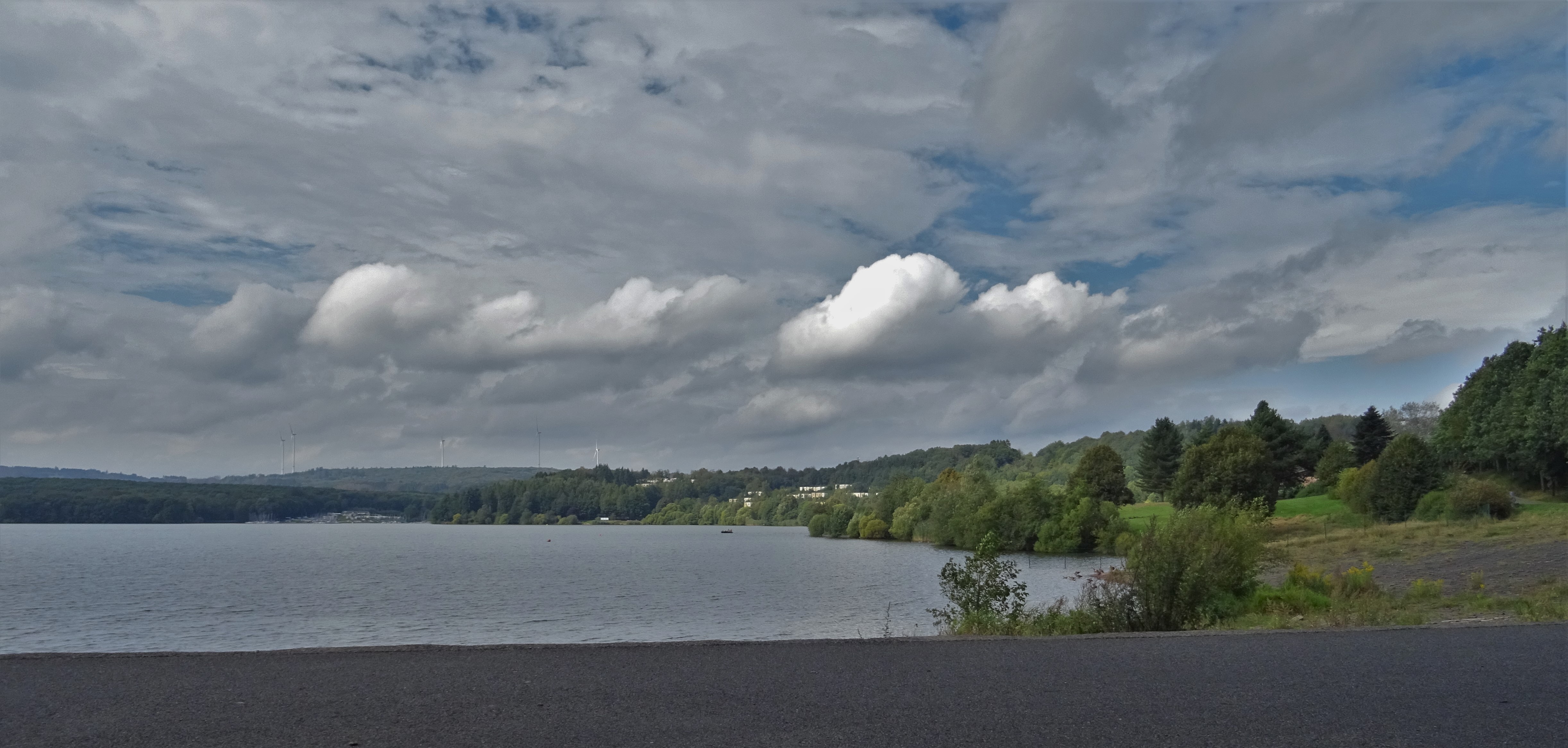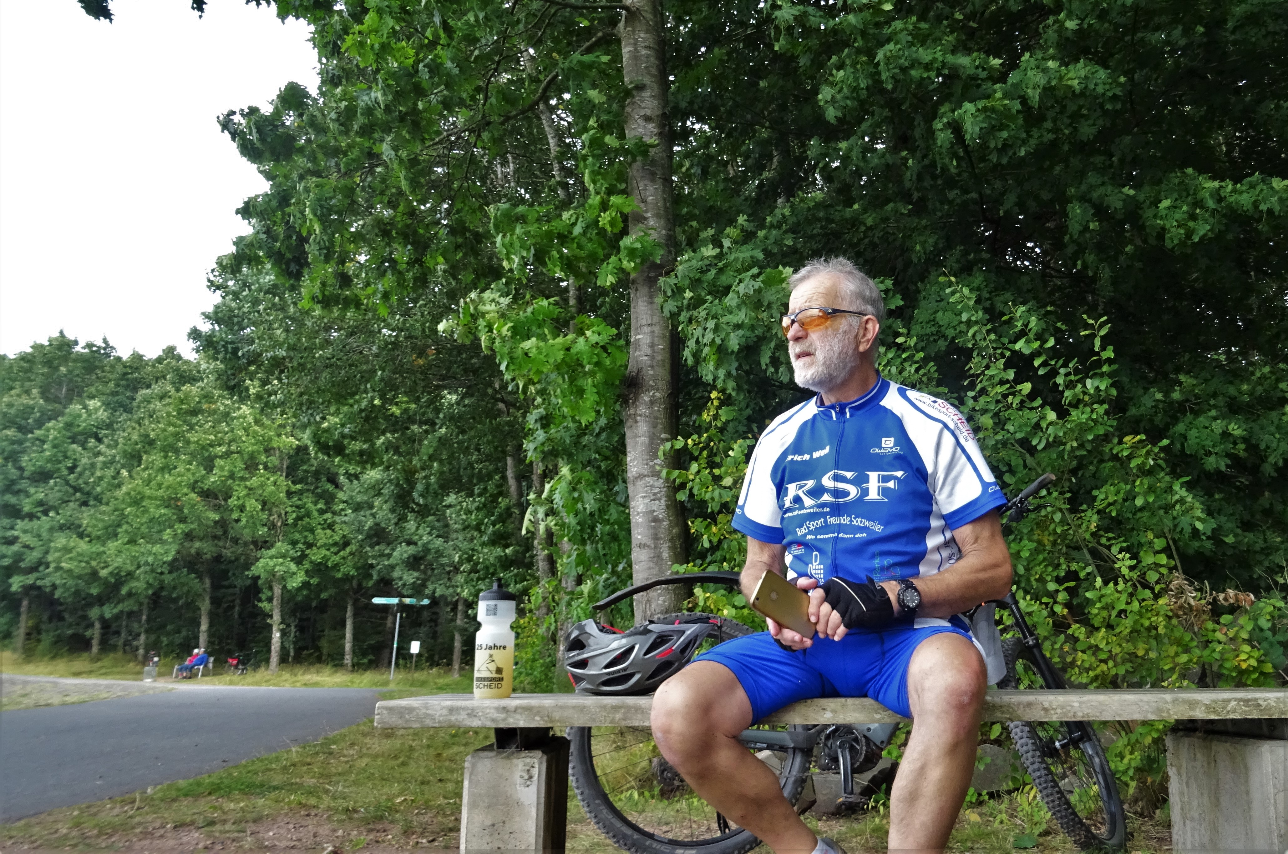 Auf dieser Standard Strecke bin ich immer wieder kleine Abschnitte etwas anders gefahren, sodass Freund Erich sich begeistern konnte. Über die Elzenberger Mühle sind wir, nach unserer Pause auf der Volksbank, Richtung Amesborn, aber vorher rechts ab zu den Windrädern oberhalb der Teufelskanzel und dann nach Oberthal. Hier habe ich mich leider etwas verfranzt bis ich zur Trasse fahren konnte.