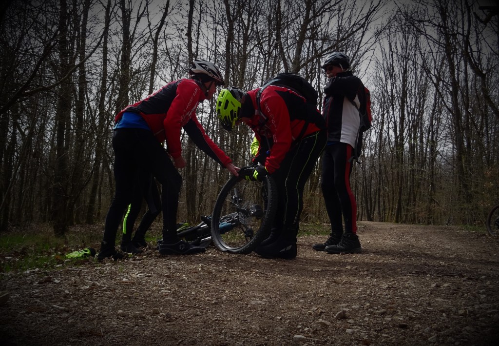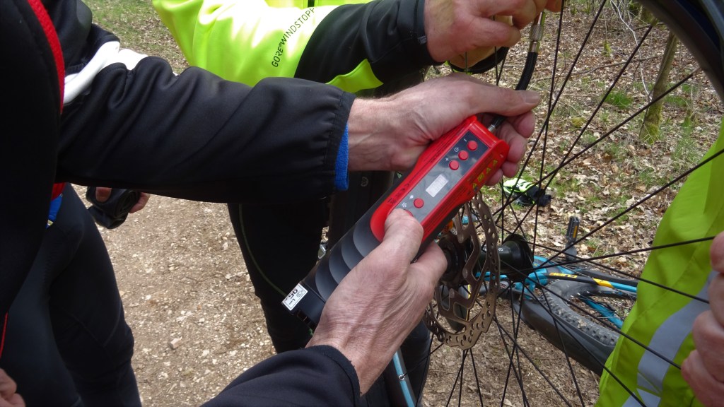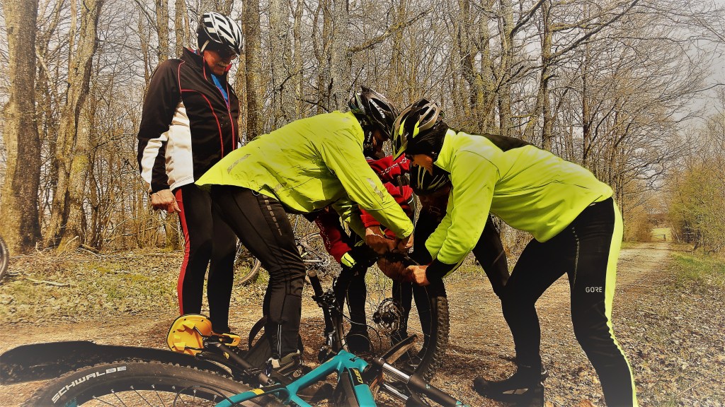 Sechs (6) Mann an der Breck fuhren mit Akku-Kraft Richtung Peterberg. Auf der Abfahrt zum E-W Gedächtnistrail hatte Wolfgang einen glatten Durchschlag des vorderen Mantels und schlagartig war die Luft raus. Aber es waren jede Mange Profis dabei, die so einen Platten im Handumdrehen flicken konnten.
