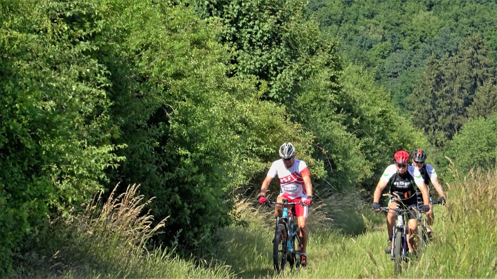 Die Gemeinschaft der Elektrifizierten wird immer kleiner, so waren nur 5 Mann an der Breck um diese Runde zu fahren. Um nicht zu viele Körner zu verbrauchen, gingen wir es langsam an. Zum Bostalsee, an der Nahequelle vorbei Richtung Peterberg, auf halber Höhe nach Neunkirchen/Nahe und einmal um den See herum. An der Staumauer, beim umgekippten Haus machten wir Pause. Abgemacht war dass der Schluss der Tour in Berschweiler beim Christine gemacht wird, so sind wir nach der Fleischbeschau auch gleich aufgebrochen und an den Mühlen Elzenberg und Nohmühle vorbei durch den Obertaler Bruch zur Bahntrasse und in Bliesen wieder runter vom Radweg. Am Augenborn entlang, ging es zur Hääd und zur Rheinstrasse. Auf dem Biberpfad ist ein klasse Trail, dem wir fast bis Berschweiler folgten.