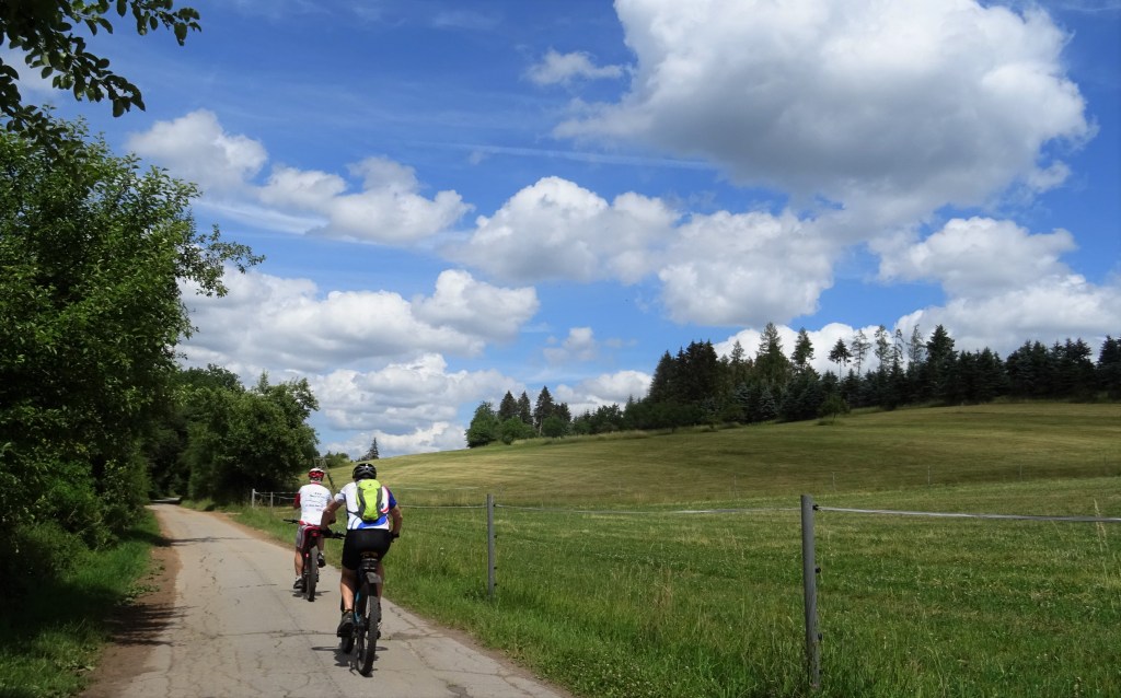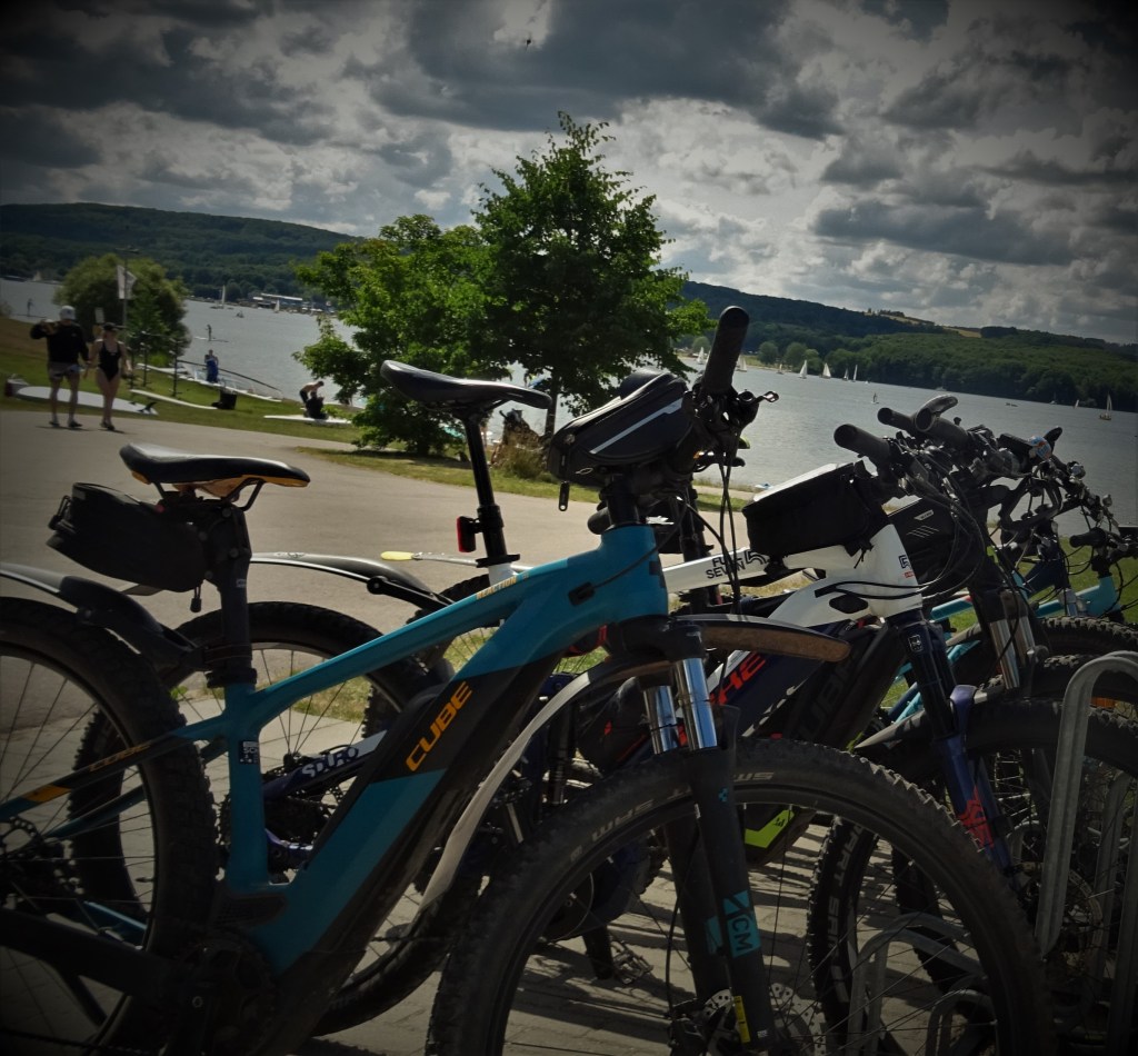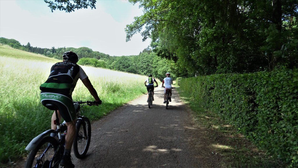 Beim weiteren Verlauf der Strecke gab es zwar auch noch Trails, aber ohne dass die Schutzbleche von den Bikes flogen. In Türkismühle wollten wir ein Eis (eine Kugel) mitnehmen, aber im letzten Augenblick sind wir doch beim „Mary“ vorbeigefahren. Am Bahnhof ging es rechts ab in den Scheidhauser Wald und über den Heidenkopf das steilstück hoch, nach Walhausen, wieder zurück zur Elzenberger Mühle und an den See. Ein Akoholfreies Getränk gab es dann noch am Haus das auf dem Kopf steht, bevor wir den See umrundeten und den Heimweg antraten