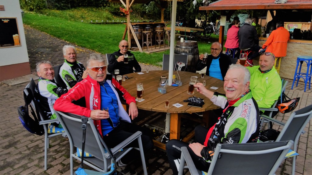 Samstag, tolles Wetter, da war der Biergarten schon gut gefüllt, aber am runden Tisch konnten wir uns mit fast allen Mann niederlassen. Geburtstags Bier und einen kurzen und noch das ein oder andere Isotonische Getränk hinterher und wir machten uns frohgemut auf den Heimweg. Es war wieder eine gelungene Samstagstour.