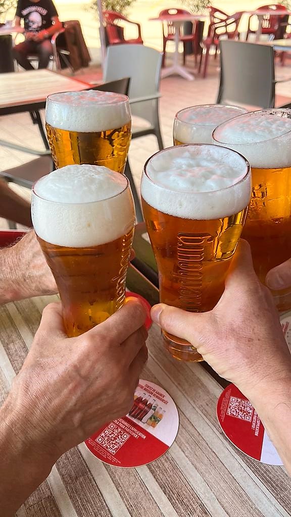 Leider (schade) gab es kein Eis und so bin ich durch die Illinger Strasse in den Ullefangerwald runter nach Wustweiler. Am Lauftreff vorbei, wo zwei Frauen vom DLRG einen Hund trainierten, der sich in einem Schlammbad wälzte und sich so richtig zusaute. Über den Rothenberg fuhren wir nach Berschweiler und der Guido nahm schnurstracks den Weg zum Biergarten beim Christine. Leider sprangen 2 Man ab, hatten andere Termine und das Kläus`chen traf auch noch eine („Schulfreundin“), aber nach 2 Isotonischen Getränken traten auch wir den Rückweg an.