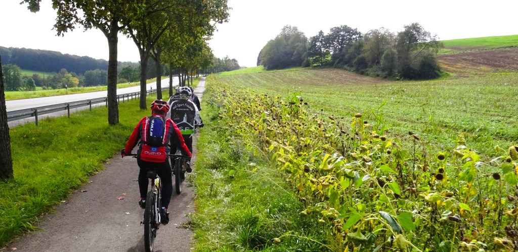 Viele Kranke, Verunfallte und anderweitig beschä(f)digte waren nicht da und so fuhren wir mit kleiner Mannschaftsstärke los. Gleich zu Beginn sagte der Guide dass er eine gute Strecke auf Komot zusammengestellt hat und als Wanderer kennt er sich auch gut in der Gegend aus. Bis wir Sotzweiler aus dem Ort fuhren hatten wir schon Fünf Kilometer. Der langweilige Teil auf der Runde ist an der Straße der B 269 entlang bis Lebach.