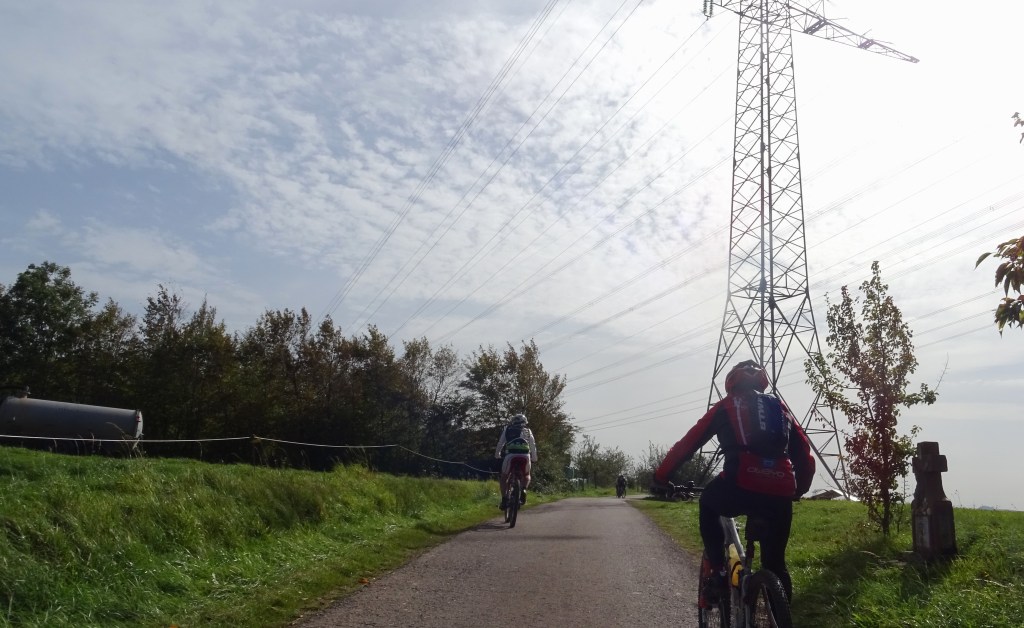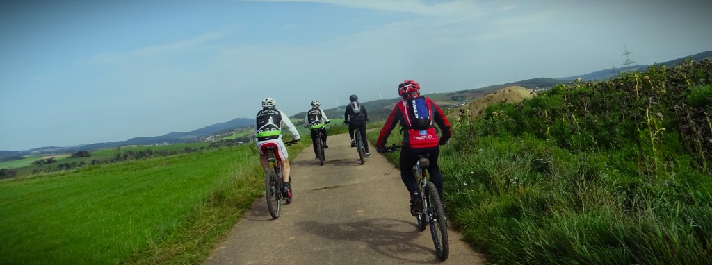 Nur nicht hetzen sind wir den Wünschberg hoch nach Habach, am Schützenhaus vorbei nach Eiweiler und zum ehemaligen Lebacher Mundepot. An der Schießanlage machten wir unsere Pause, bevor wir nach Falscheid und Richtung Nordschacht fuhren. Unser Guide hatte aber andere Pläne und bog Rechts ab auf einigen Trails den Hoxberg hoch, an der Motocrossbahn vorbei und auf der anderen Seite den Hügel wieder runter nach Knorscheid. Auf der Radtrasse wurde schon gemunkelt dass wir beim Bahnhof ein Eis schlecken wollten, Zwei Bällchen Eis und ein wenig Aufwärmen in der Sonne und wir traten den Rückweg an, wieder an der Strasse entlang nach Aschbach, durch Exweiler bis Sotzweiler.