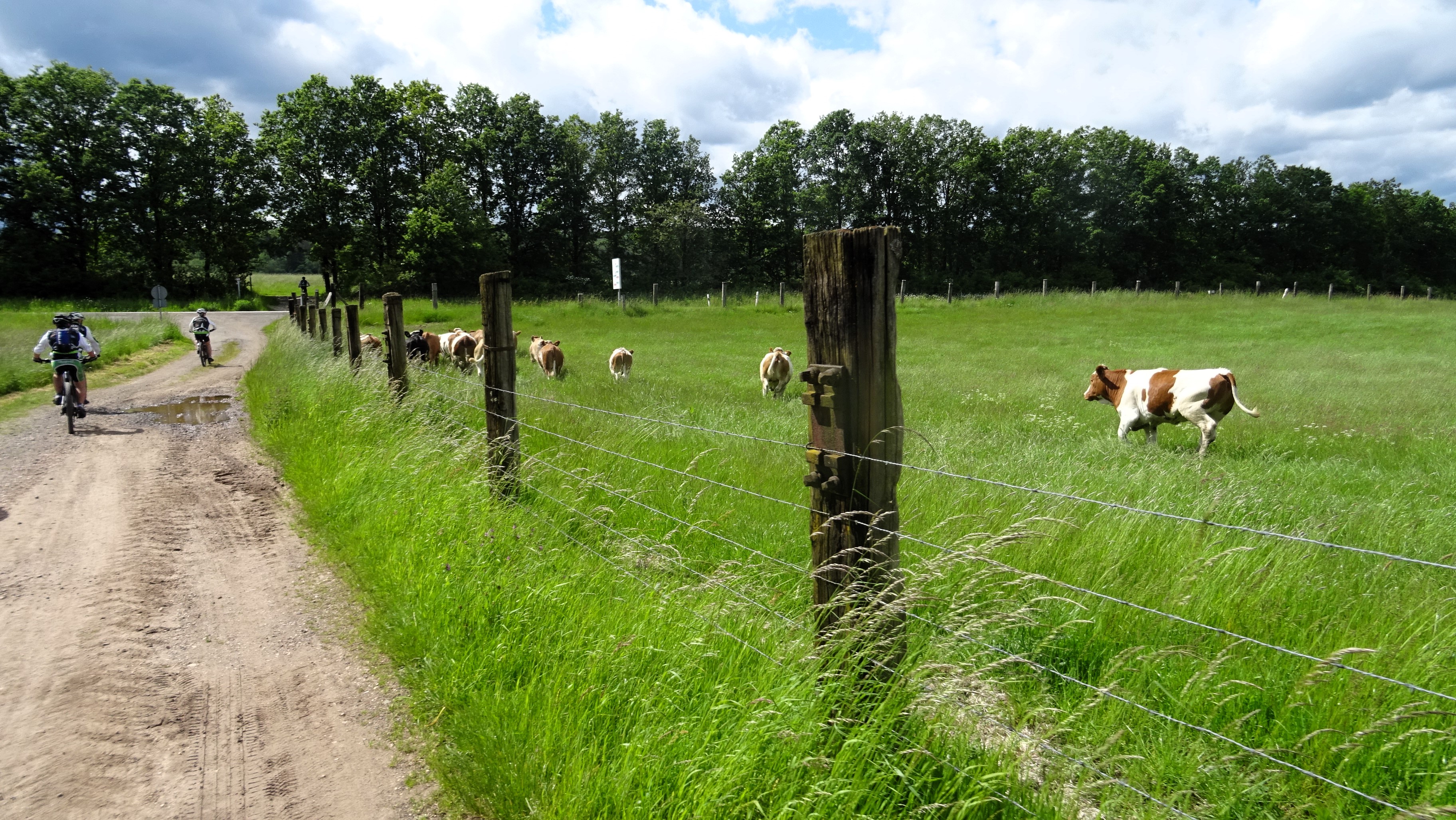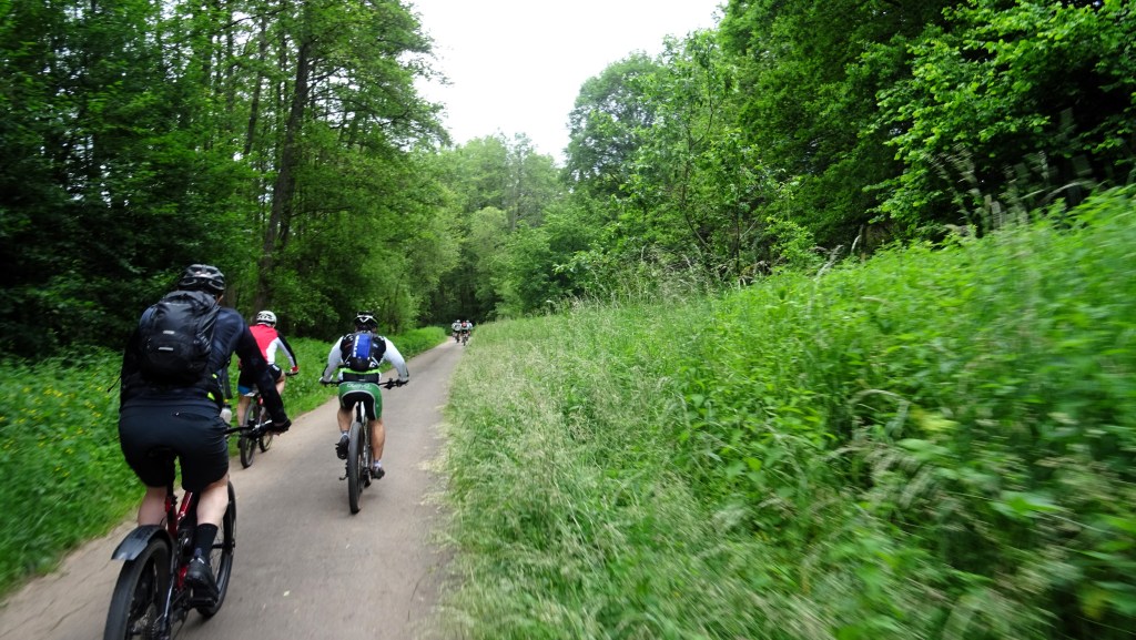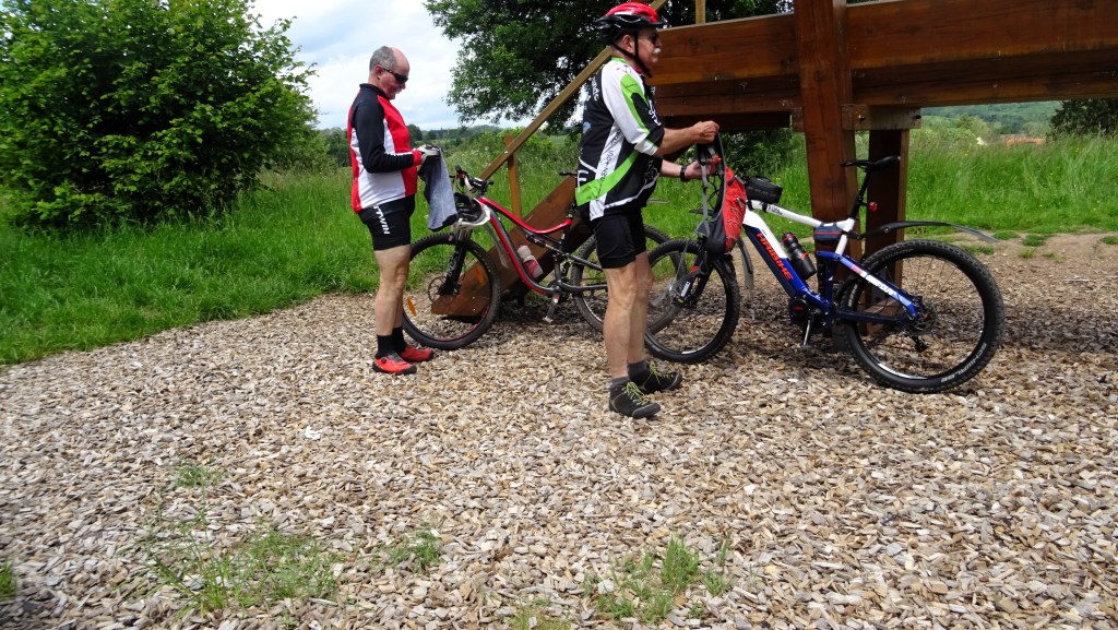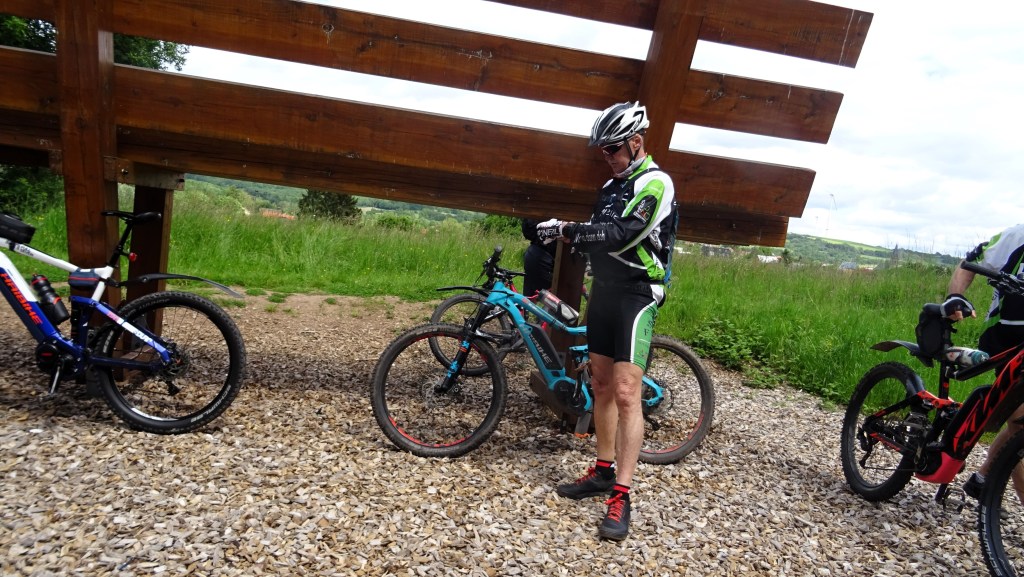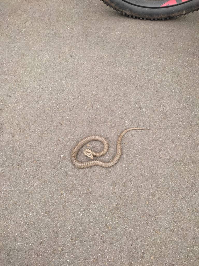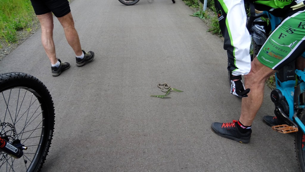Armins Rad rattert und knattert, Die Kreuzotter oder Ringelnatter, wer weiß schon sogenau was da rumliegt? 8 Mann an der Bregg und ein Guide der uns kreuz und Quer durchs Nördliche Saarland hetzt. Gegenüber den (STT) Teertouren der letzten Wochen war es mal wieder eine Anspruchsvollere Strecke. Auf dem Neuen Radweg St.Wendler Land machten wir bei Wolfersweiler auf der Riesen XXL Bank die Bananenpause. So etwa ein oder zwei Kilometer vorher haben wir die Schlange die sich auf dem warmen Teer sonnte fast überfahren. Nach gutem zureden und mit Stöckchen verscheuchen ist sie vondannen geschlichen. Die Biergärten auf der Strecke liessen wir alle links und rechts liegen und sind auf schnellstem Weg zurück nach Sotzweiler. Gespannt bin ich wielange Armin mit seinem Ratter Rad noch mitfahren kann.