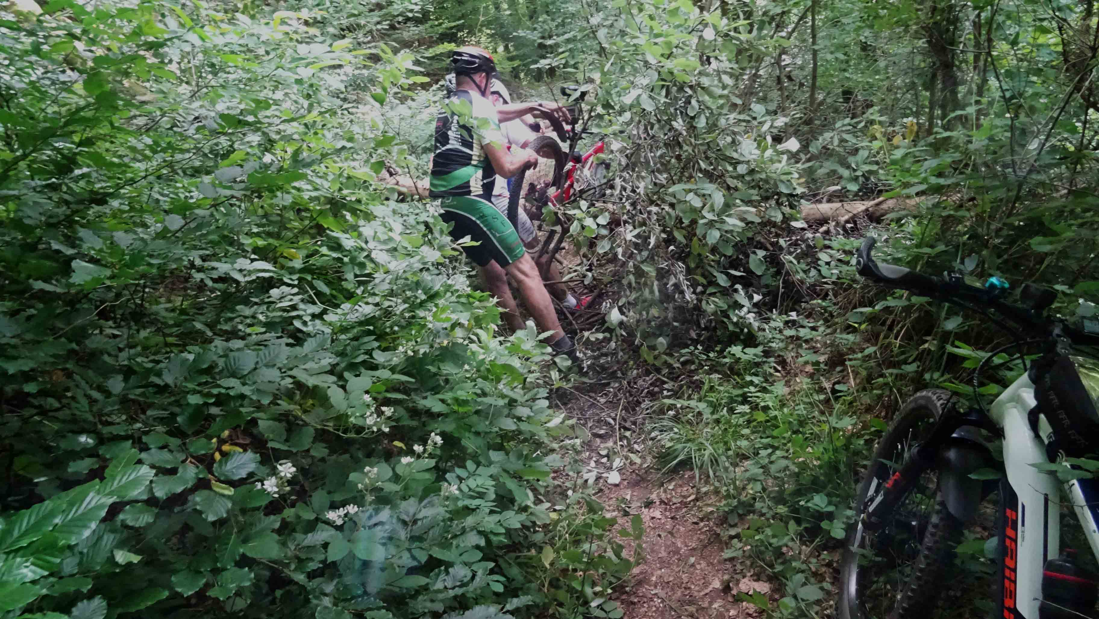 Das ganze Jahr bis heute sind die Trails auf unseren Touren ausgeschlossen worden und gerade auf dieser Strecke wollten sie den Wanderweg der Tafeltour hinterm Sägewerk testen, war ein schöner reinfall auf 300 Metern mussten wir über und unter drei dicken Stämmen klettern und ein E-bike hat schon einige Kilos, aber Hand in Hand wurde auch das gemeistert.