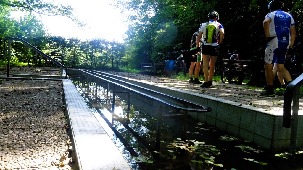 Aber zum Anfang: an der Brücke haben sie mir die Bürde des Guides in die Hand gegeben und wenn ich dann fahre geht es oft Richtung meiner alten Heimat. Die Abfahrt durch den Engscheider Wald mit kleinem Trail am kleinen Weiher vorbei, am Exweiler Weiher entlang und hoch zum Finkenrech, wo uns der Forst wegen Baumfällungen zu einer anderen Route zwang nach Dirmingen und dann auf den Eichenlaubpfad bis Eppelborn. Im Dirminger Wald fuhren wir zur Wassertretanlage und im weiteren Verlauf zu der Marienkapelle und dann noch einen schönen Trail runter und weiter nach Hierscheid bis Humes, wo bei der Kirche am Kirmesplatz leider kein Eismännchen war, so sind wir dann durch den „Egge“ zum Uchtelfanger Wald, runter zum Schwimmbad. Hinter dem Bad ist noch eine Wassertretanlage, hier wurde die Bananenpause gemacht. Auch diese Wassertretanlage ist einer meiner Lieblingsorte und der Weg, der zur Schutzhütte Schaumberblick auf die Höhe führt, wo man dann diesen wunderschönen Ausblick zum Schaumberg und ins Nördliche Saarland hat. Der Rückweg nach Wustweiler hoch zur LTF Laufstrecke, weiter an der Urexweiler Hundehütte vorbei, den Rothenberg runter nach Berschweiler. Mehr als die Hälfte der Freunde fuhren noch in den Biebergarten, die anderen zog es zu Kaffe und Kuchen nach Hause. Eine gemütliche Stunde mit viel Bla Bla, alte Bekannte treffen und auch wir machten uns auf den Heimweg, aber auf dem steilsten Weg zu den Windrädern und über die Hohe Straße zurück nach Sotzweiler. Man soll sich ja nicht selber loben, aber die Runde ist gut gelungen.