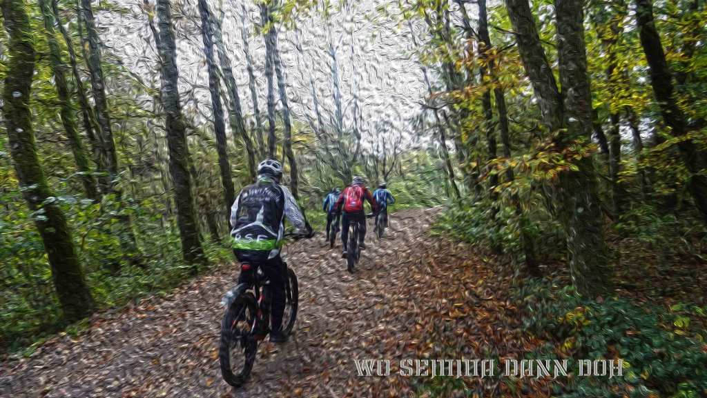 Zum Wochenende werden es immer weniger Biker die Mitfahren und so sind wir nur zu fünft auf diese Tour. Trocken und schnell musste die Fahrt werden, da vier Uhr das Limit war. Benno machte den Anführer und wir folgten Mann für Mann: warm Stubb, durch Thöley auf die Trasse bis Oberthal, nach Güdesweiler, an der Liebenburg vorbei nach Namborn bis Roschberg, was der weiteste Punkt der Strecke war und so sind wir >ab da auf der Rückfahrt gewesen. Am Baltersweiler Sportplatz machten wir unsere Pause. Weiter dann nach Bliesen und in der Nähe vom Bistro am Radweg unterquerten wir den Wendalinus Fahrradweg und fuhren am Augenborn vorbei zur Alsweiler Hääd und hier wurde dem Einheimischen Mäbinger klar gemacht wie wir am schnellsten durch Alsweiler nach Marpingen, an seinem Elternhaus entlang und zur Hohen Strasse kommen. Nun hat er den Plan.