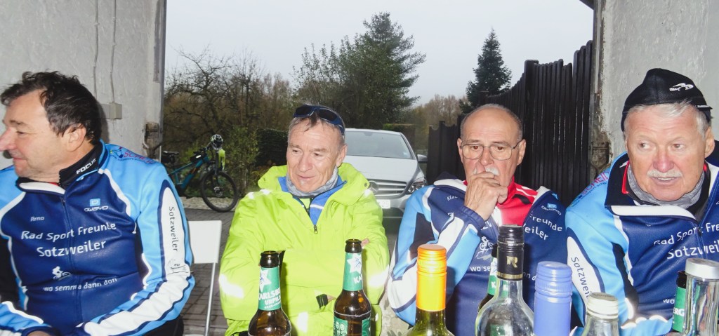 …eine Schnapszahl, die Herbstliche Nebel Geburtstagstour war aber keine Schnaps Idee, obwohl Schnaps auch eine Rolle spielte. Unser Alterspräsi führte uns heute an, nicht an der Nase, sondern auf viele Trails, schöne, einer besser als der andere. Los ging es durch die Niederwies, die erstaunlich gut zu durchfahren war, zu den Tennisplätzen und nach Hasborn weiter an der Sombach entlang und nach der überquerung der Strasse nach Primstal in den Katharinenwald. An der dicken „Krampfeiche“ ist er abgebogen zum Friedwald und J.A.Mühle, durchs Wachsgut fast nach Gronig, aber vorher dann doch durchs Orletal, an der jungen Blies und einigen sehr schön gelegenen Weihern vorbei. Vor Selbach ist er zum Losenberg und über den Rötelsteinpfad mit vielen rutschigen Wurzeln zur Nohmüle. Hier machten wir einige Paus(en) P-P und auch die Bananenpause. Der Rückweg nicht ganz so spannend, am Römerhof vorbei nach Gonnesweiler, am Selbacher Friedhof entlang und wieder in den Katharinenwald, weiter bis zum“Roten Meer“ und dann zum Schützenhaus und den schwarzen Stock runter nach Leitzweiler. In Weiler dann vom Meister „Jungs nur noch 500 Meter“ und wir waren beim Guide in der Garage.