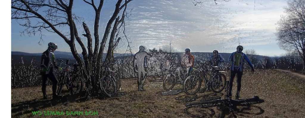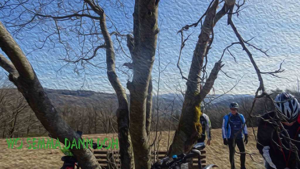 Meine Hausstrecken führen fast immer in meine alte Heimat, aber „KK“ fährt am liebsten Richtung Nonnweiler, ob mit seinem Rennrad oder MTB und da kennt er sich auch noch ziemlich gut aus. Von Primstal den Handenberg hoch auf die MTB 4 oberhalb von Kastel den Röderberg hoch wo auf dem höchsten Punkt die Bananenpause gemacht wurde. Im weiteren Verlauf hat er ein Stück der MTB 4 ausgelassen da im Winter doch sehr viel Matsch die Räder schmutzig machen würde und ist dann den Berg links runter auf die Landstrasse von Kostenbach nach Bierfeld und weiter auf den Neuen Radweg St.Wendler Land bis zum Bostalsee. Hier haben wir Heinz verloren (Familien treffen) am Haus das auf dem Dach steht.