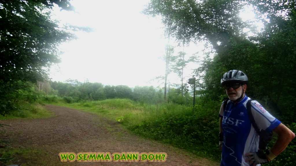 Los ging die Tour durch die Niederwies, dann bei den Elchen am Tennisplatz entlang und nach queren der Autobahn nach Steinbach, Homesmühle und Aschbach. Da sind wir am Hundeplatz vorbei und steil hoch und oben dann wieder runter über einen Wiesenpfad bis zur Josefskapelle. Ein paar Meter weiter links in den Wald und ein fast zugewachsener Trail führt hoch fast bis zur Autobahn, aber vorher rechts auf den Galgenberg. Runter dann nach Calmesweiler und durch den Fröschengarten, an derLandes Forst Schule entlang und bei der Langenauer Siedlung links in den Dirminger Wald zur Wassertretanlage. Hier machten wir unsere Pause. Man hat von da auch einen Guten Blick zum Schaumberg und da war der Himmel schon zugezogen und man sah den Regen der da runterkam, das trifft uns aber nicht, so kann man sich täuschen, die Banane war noch nicht verdrückt und schon fing es an, erst ein paar Tripse und dann tat sich der Himmel auf zumindest 10 Minuten lang. In die Humes wollte ich da auch nicht mehr, so sind wir dann durch Dirmingen und nach Berschweiler, wo wir dann auch noch den Weg zu Christine fanden. Den Rückweg dann den steilsten Weg hoch bis auf die Hohe Straße.