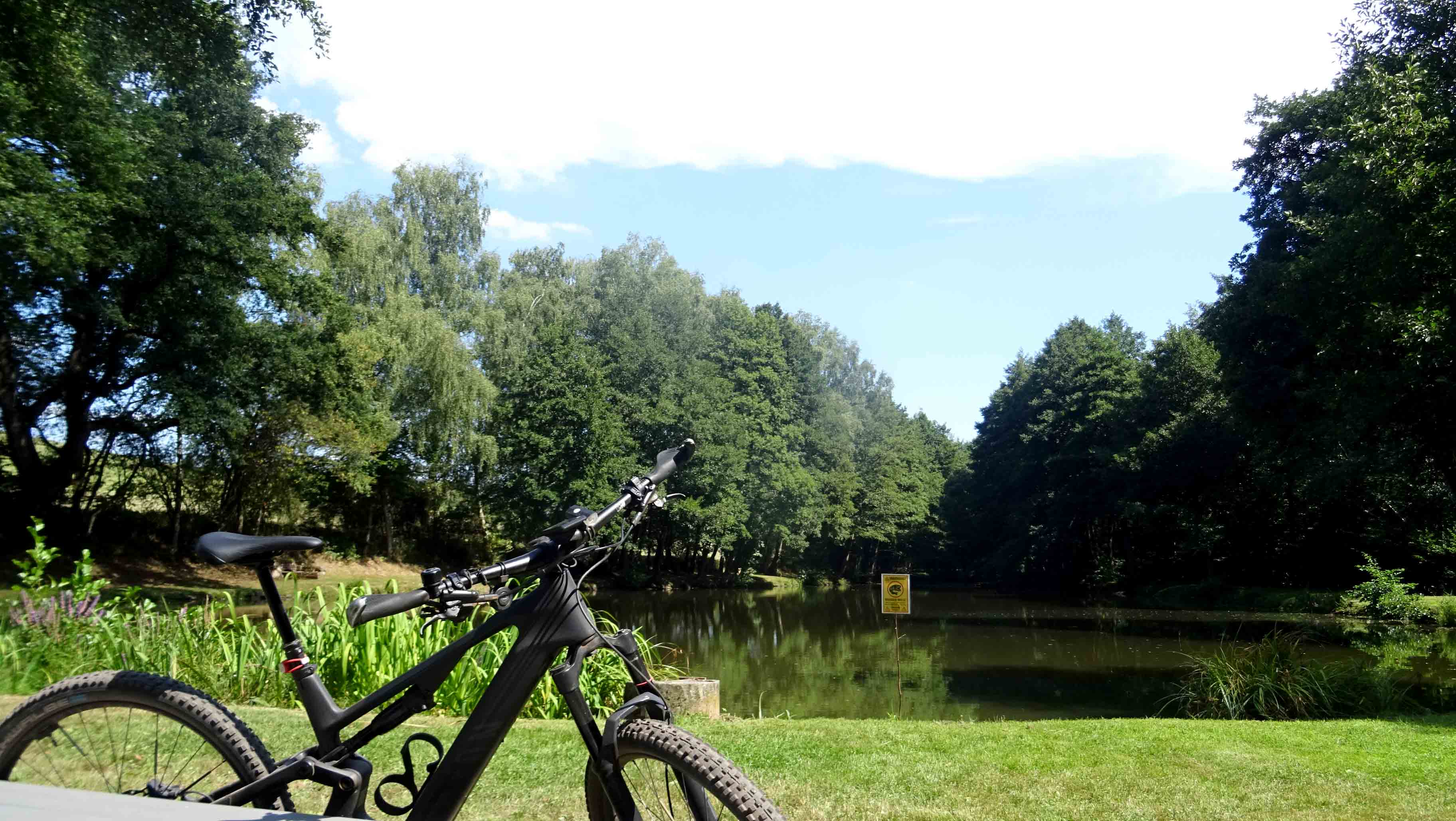 Mit Klaus durch seine alte Heimat durch Urexweiler. Gleich zu Anfang hat man festgelegt, der Abschluss wird bei Christine gemacht und als der Guide dann zum Exweiler Weiher und zur Hohen Straße, nach Berschweiler fuhr dachte ich das wird eine kurze Runde, aber dann hat er doch noch die Kurve gekriegt und ist zum Frankenbacher Hof und zur Hundehütte und hier Rechts abgebogen Richtung Hüttigweiler. Auf halber Strecke ist er dann links runter auf einen Weg den er früher als kleiner Bub mit seinem Vater gegangen ist nach Exweiler. Weiter auf der Straße wo vor Zwei Jahren der Tornado wütete nach Hirzweiler und zum Schutzgebiet Kiesgrube. An dem Weiher vom ASV blieb er und wir machten unsere erste Pause.