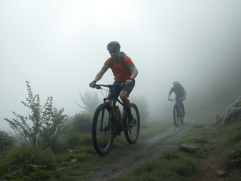 …und doch Klatschnass. Samstag, da kommt keiner hinterm Ofen hervor und so sind Benno und ich Richtung Bostalsee aufgebrochen, es regnete nicht und trocken sollte die Tour werden, ohne Schlamm und Dreck von unten. Hat auch gut funktioniert bis zu See. An dem Rondel an der Surfer Basis machten wir unsere Pause, da standen wir schon in dichtem Nebel und tiefen Wolken, die uns auf dem Rückweg bis nach Sotzweiler begleiteten. Es regnete zwar nicht aber das Wasser ist trotzdem aus Wolken und Nebel in Rinnsalen vom Kopf bis Fuß von den Klamotten gelaufen. Gut dass ich Zuhause schon die Regenjacke angezogen hatte.