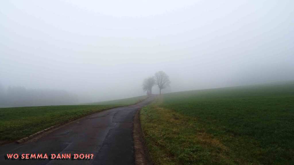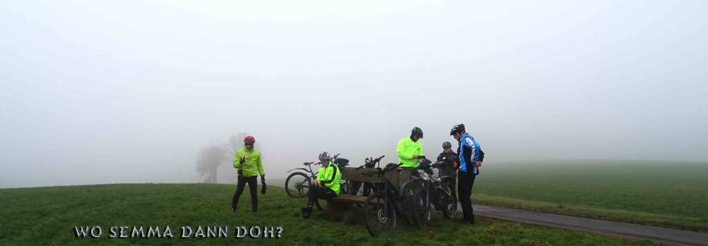 6 Mann an der Bregg die sich bei diesen Wetterbedingungen auf die Socken machten. Guide Benno sagte was von Mosberg/Richweiler, aber am Ende war es doch nur Hofeld/Mauschbach, was aber der Runde keinen Abbruch tat, außer dass man stellenweise keine 100 Meter weit sah. Zwischen Roschberg und Baltersweiler machten wir unsere Pause und dann ging es auch schon weiter Richtung Heimat. Ab Bliesen wieder auf den Radweg bis Tholey und nochmals an der Ponderosa vorbei nach Bergweiler.